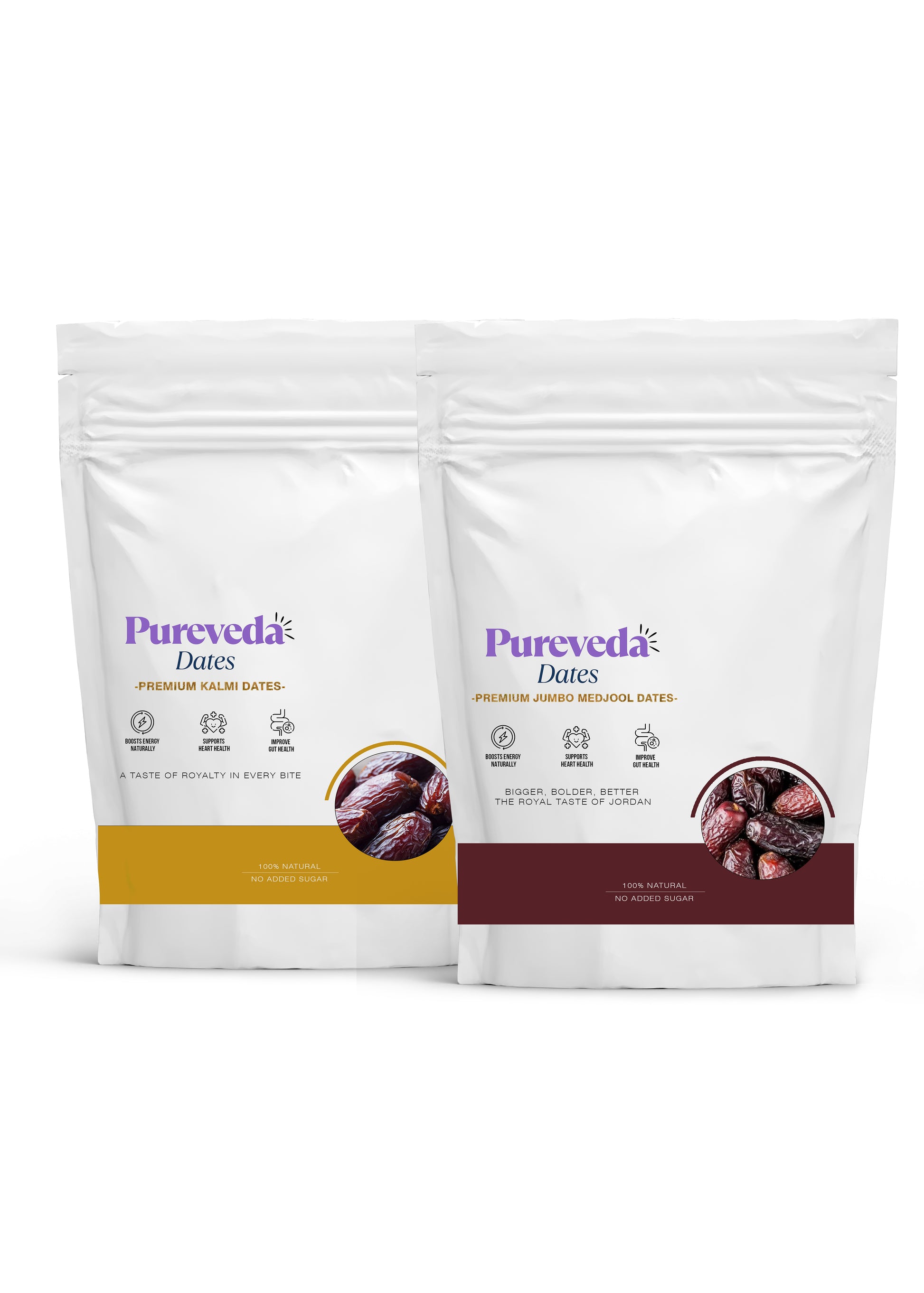 PureVeda’s Medjool & Kalmi Dates Combo offers the perfect balance of indulgence and nutrition. Enjoy the rich, caramel-like sweetness of Jumbo Medjool dates paired with the mildly sweet, chewy Kalmi — ideal for both special moments and daily snacking.