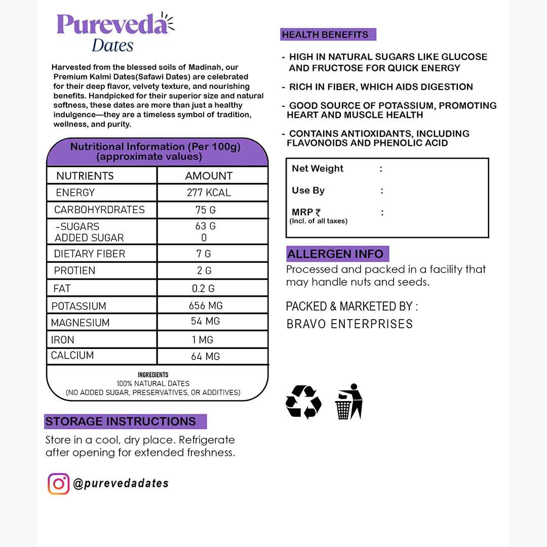 PureVeda’s Kalmi Dates are medium-sized, dark, and slightly dry with a soft bite and mild sweetness. Loved for their balanced flavor and health benefits, they’re ideal for daily snacking.