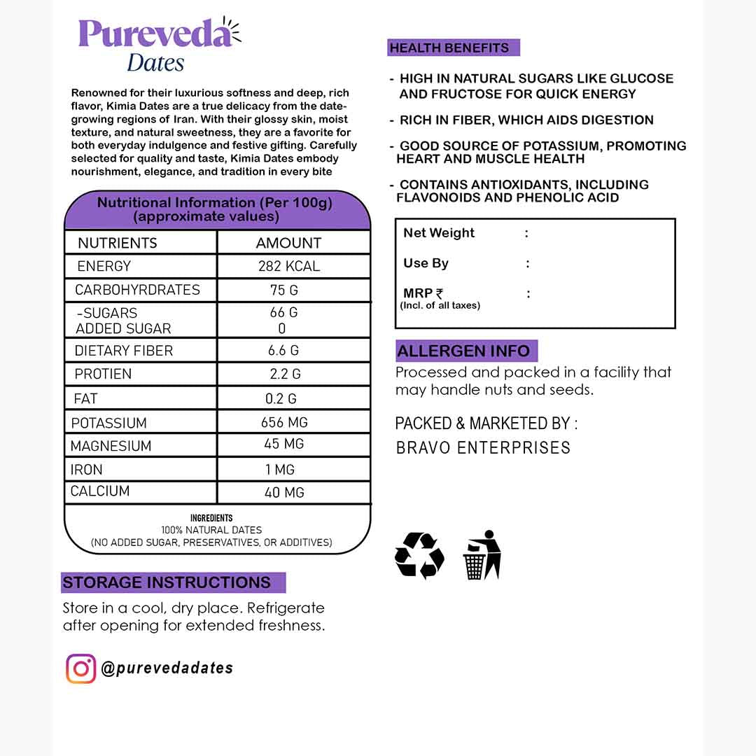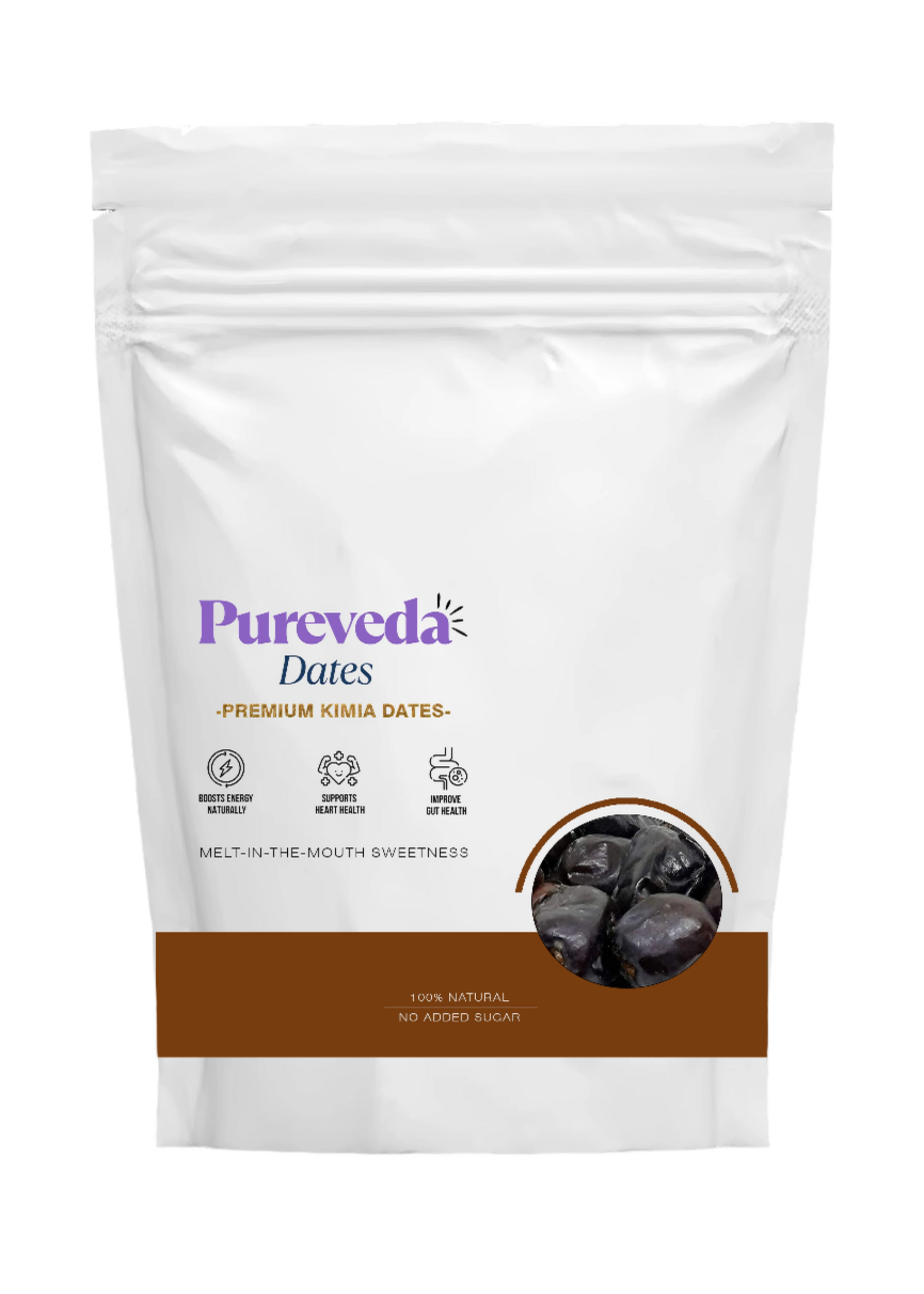 PureVeda’s Kimia Dates are known for their rich taste, soft texture, and glossy dark skin. These premium dates are a popular choice for everyday indulgence and festive gifting.