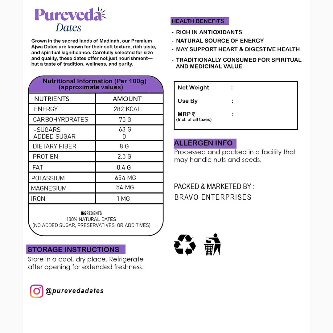 PureVeda’s Large Ajwa Dates are soft, luscious, and naturally sweet — a perfect blend of taste and wellness. Known as the “King of Dates,” Ajwa is rich in essential nutrients and antioxidants.